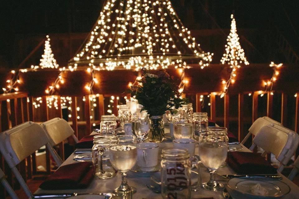 We have 5 permanent chandeliers and additional lighting wrapped around beams in The Barn. There is ample lighting on the porch and parking area.